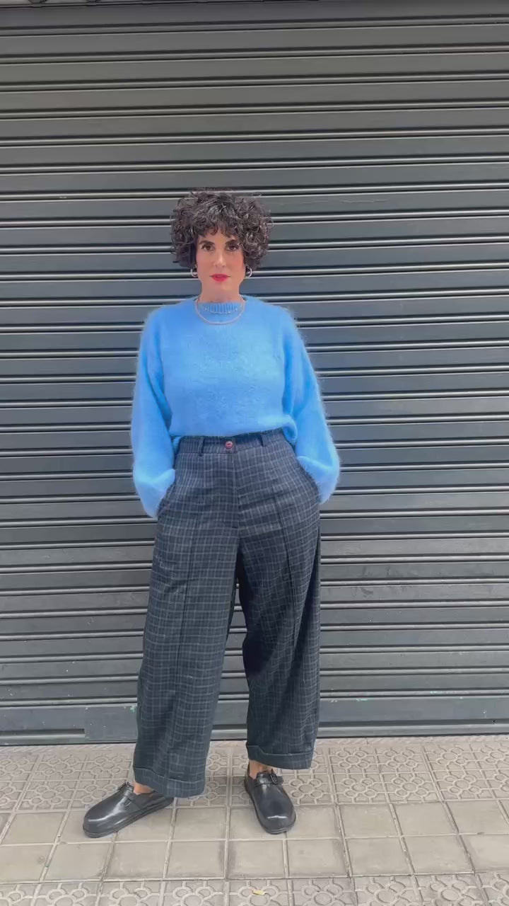 Pantalón ancho de cuadros en tonos azul y verde oscuro. De tejido suave y fluido, con pinzas y vuelta en el bajo, aporta comodidad sin perder forma. Perfecto para otoño, combina con jerséis en tonos crema o grises y calzado plano o botines.