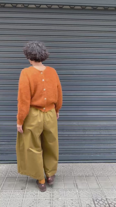 Pantalón amplio con cintura elástica fruncida y un volumen ligero que lo hace muy cómodo. El tejido es suave y fluido, en un tono verde oliva perfecto para los looks de otoño por su aire natural y cálido.