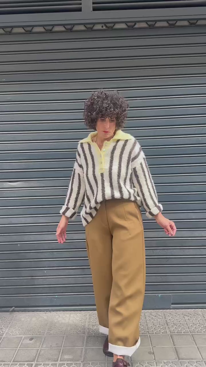Pantalón ancho en color marrón oliva, confeccionado en un tejido con cuerpo y buena caída. Presenta pinzas en la parte delantera que aportan volumen y detalle de vuelta en el bajo en tono gris claro, creando un contraste original. La cintura es limpia, con cierre oculto y un pequeño adorno de estrella metálica en un lateral que añade un toque especial. Una prenda versátil y con carácter, ideal para combinar con camisas, jerséis ligeros o blusas, logrando looks sofisticados y cómodos.