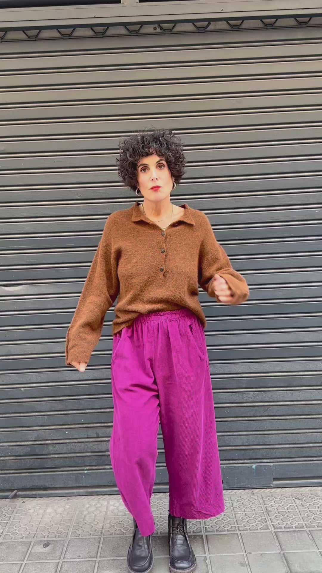 Pantalón ancho de pana fina en color berenjena, con cintura elástica y bolsillos laterales. Su textura es suave y aterciopelada, de esas que abrigan sin pesar, perfecta para los días frescos de otoño. El corte recto y fluido le da un aire relajado y favorecedor, ideal para combinar con jerséis de punto o camisas claras. Un toque de color intenso y elegante para los looks de temporada.