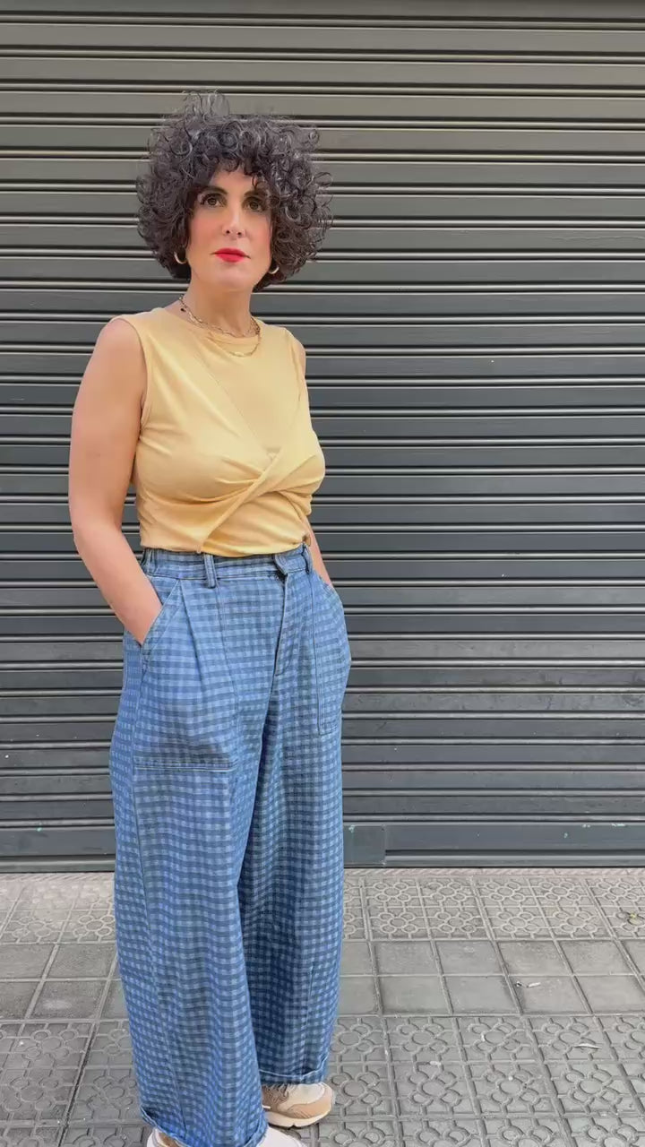 El tejido tiene cuerpo pero es ligero, perfecto para primavera-verano. El cuadro en tonos azules aporta textura visual y un punto especial sin resultar excesivo.
