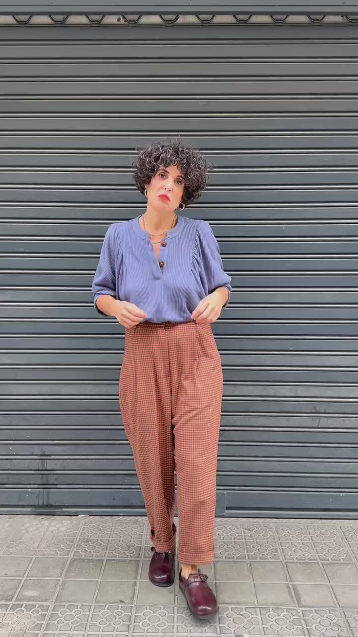 Pantalón de pata de gallo en tonos marrón y negro, con pinzas frontales y corte ligeramente abombado que afina al tobillo. Su tejido con cuerpo pero suave aporta comodidad sin perder estructura. Perfecto para combinar con jerséis de punto o camisas lisas en los tonos del otoño.