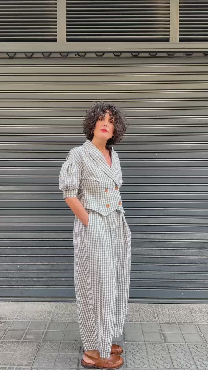 Pantalón de silueta amplia y volumen marcado, con cintura fruncida y botón central que aporta un detalle sutil. La pernera ancha y ligeramente abombada crea movimiento y una caída muy favorecedora. Confeccionado en un tejido ligero y fresco, perfecto para la temporada de primavera-verano. Su estampado de cuadros en tonos neutros combina fácilmente con camisetas lisas en blanco, negro o verde suave. Ideal para un look cómodo, natural y con un aire desenfadado.