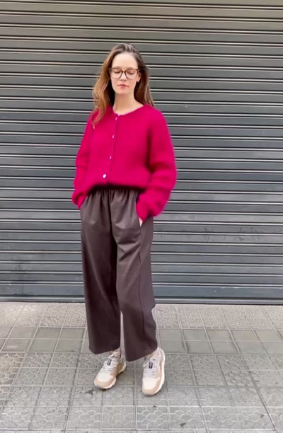 Pantalón con estampado de microcuadro en tonos marrón y negro. De tejido ligero y cintura elástica, ofrece una caída cómoda y elegante. Perfecto para otoño, combina con jerséis de punto o camisas claras y botines.