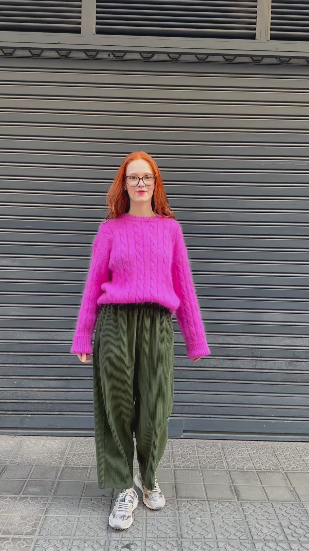 Pantalón ancho de pana fina en verde bosque, con cintura elástica y un corte relajado que lo hace muy cómodo y favorecedor. La textura de la pana aporta calidez y un encanto otoñal, mientras que el color, profundo y versátil, combina con prácticamente todo.