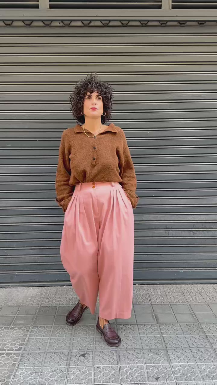 Pantalón de tiro alto en color teja rosado, con pliegues marcados en la parte delantera que aportan movimiento y elegancia. De corte recto y amplio, es una prenda cómoda y versátil que estiliza la silueta. Ideal para combinar con blusas ligeras, camisas clásicas o jerséis ajustados, creando looks sofisticados y actuales.