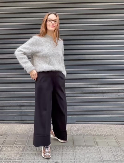 Pantalón palazzo en color negro, confeccionado en un tejido fluido con buena caída que aporta movimiento y elegancia. De tiro medio y corte ancho, presenta bajo con vuelta ancha que le da un toque sofisticado. Su diseño minimalista lo convierte en una prenda versátil, perfecta para combinar con blusas, camisas o jerséis ajustados, tanto en looks de oficina como en conjuntos más desenfadados.