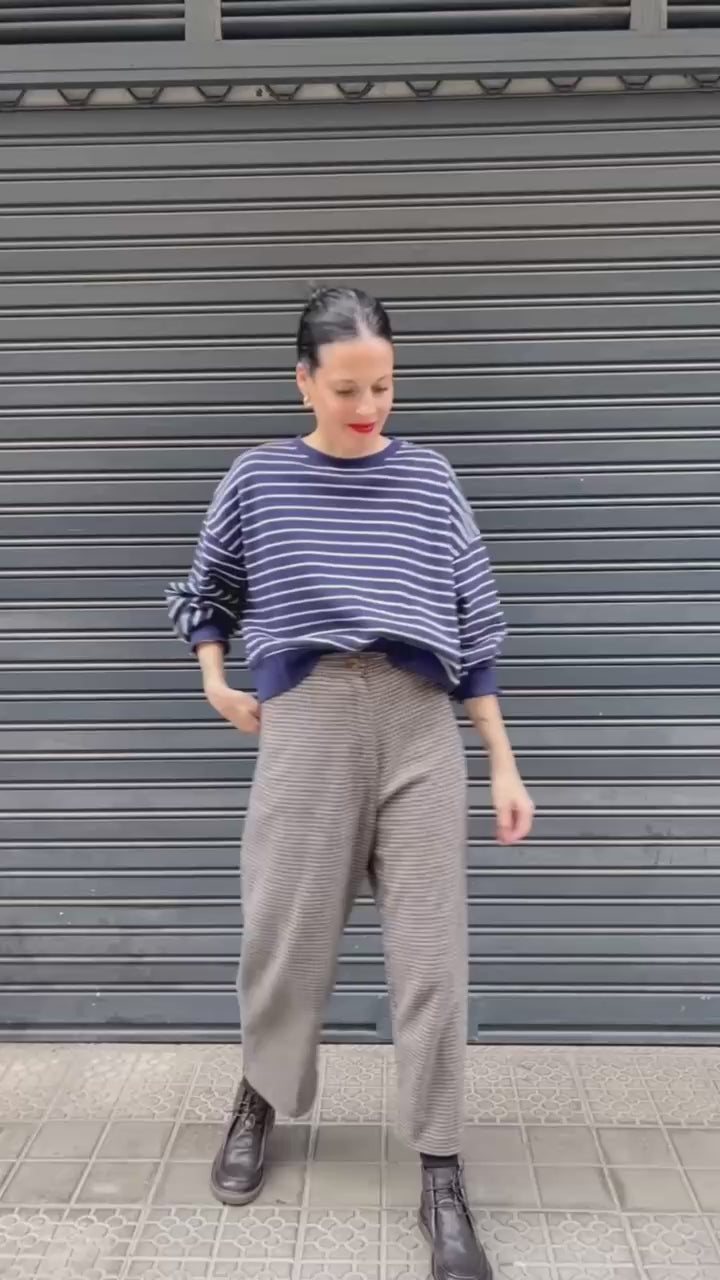 Sudadera marinera en azul marino con raya fina cruda, un básico cómodo y atemporal para el otoño. Tiene un corte recto y relajado, puños marcados y un tejido de punto suave que aporta calidez sin peso. Perfecta para los días fresquitos, va genial con vaqueros, pantalón beige o faldas largas tipo midi para un look casual y muy fácil de llevar. Añade una gabardina o una chaqueta acolchada y tienes el conjunto ideal para la temporada.