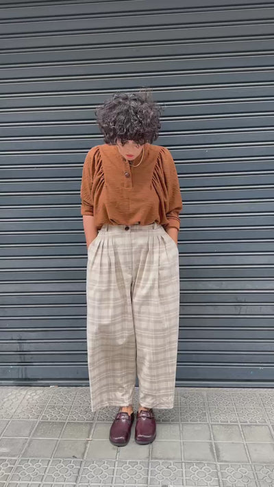 Jersey en tono cacao con cuello redondo y dos botones de madera en el escote. Su tejido con textura y caída natural aporta calidez y movimiento. Los frunces en los hombros suavizan la silueta. Ideal para combinar con denim o con pantalones de pana en los días otoñales.