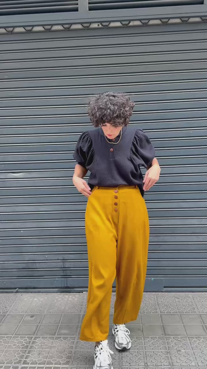 Sudadera negra de cuello redondo con dos botones en el escote y frunces en los hombros que aportan volumen y movimiento. Confeccionada en un tejido suave y fluido, combina comodidad y elegancia discreta. Perfecta para llevar con pantalones de pinzas o faldas amplias durante el otoño.