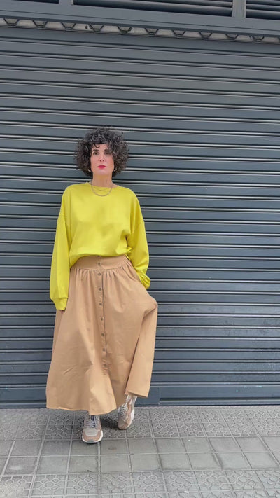 De corte amplio y relajado, con cuello redondo y manga larga ligeramente caída, que puede remangarse con naturalidad. Confeccionada en un tejido suave y agradable al tacto, con caída ligera y cómoda.