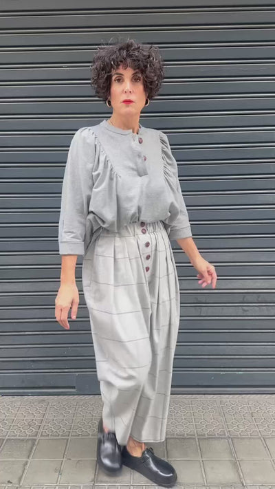 Sudadera gris de algodón con cuello redondo y dos botones en el escote. Su diseño con frunces en los hombros aporta volumen y un aire romántico. Cálida y suave al tacto, perfecta para el otoño combinada con pantalones amplios o faldas midi.