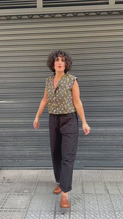 Top de silueta recta y corte ligeramente corto, con escote en pico y cierre frontal que enmarca la figura. Confeccionado en un tejido ligero con textura suave, ideal para la temporada de primavera-verano. Su estampado floral en tonos rosa y amarillo sobre fondo oscuro aporta un aire alegre y combina muy bien con pantalones blancos, denim claro o faldas lisas en tonos neutros. Perfecto para llevar solo como top y dar un toque fresco y especial a cualquier conjunto.