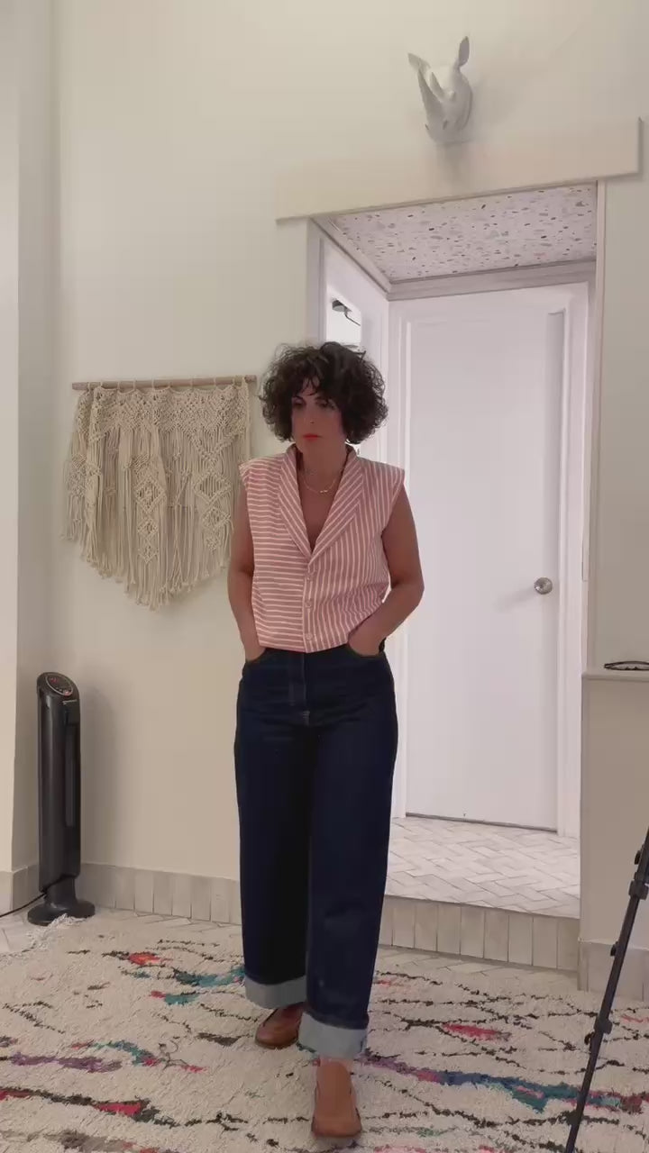 Top de silueta recta y corte ligeramente corto, con solapa suave y cierre frontal abotonado que aporta un aire relajado. Confeccionado en un tejido ligero y fresco, ideal para la temporada de primavera-verano. Su estampado de rayas en rojo y blanco, combinadas en distintas direcciones, le da un punto original y muy favorecedor. Perfecto para llevar con pantalones blancos, denim claro o incluso con la prenda a juego y crear un conjunto con personalidad y frescura.