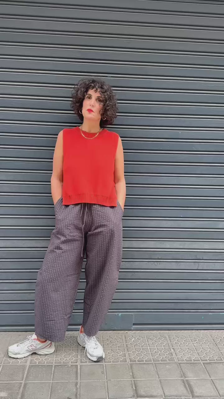 Top de punto sin mangas con cuello redondo y silueta ligeramente recta. Confeccionado en un tejido de punto suave y ligero, presenta acabados acanalados en el cuello y el bajo que le dan estructura y un aire cuidado. Su tono rojo teja aporta calidez y luminosidad, ideal para la temporada de primavera-verano. Perfecto para combinar con faldas estampadas, pantalones amplios o sobre vestidos ligeros, creando conjuntos sencillos con un toque de color.