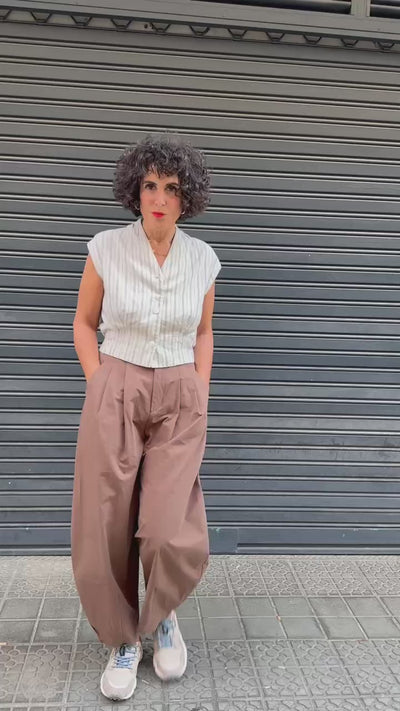 Top sin mangas de silueta recta y ligeramente cuadrada, con escote en pico suave y cierre frontal con botones que aporta un aire sencillo y favorecedor. El tejido, ligero y con textura natural, presenta un estampado de rayas verticales en tonos neutros que estilizan visualmente. Ideal para la temporada de primavera-verano por su frescura y comodidad. Combina perfectamente con pantalones fluidos en lino, denim claro o faldas en tonos tierra para un look natural y desenfadado.