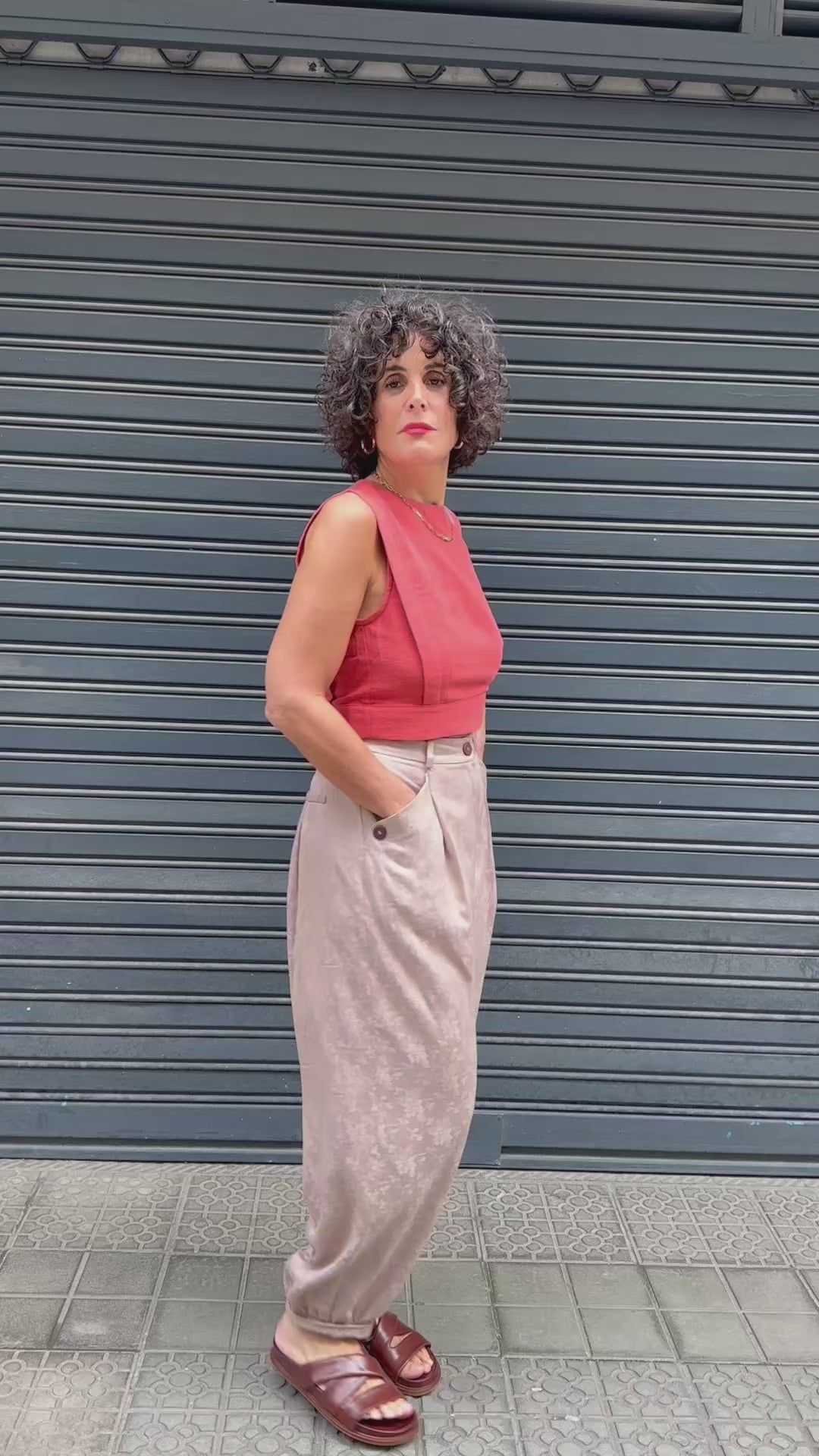 Top corto sin mangas con cuello redondo y silueta recta ligeramente estructurada. Confeccionado en un tejido ligero de tacto natural, presenta un bajo ancho y un lazo en la parte posterior que permite ajustarlo y aporta un detalle delicado. Su tono rojo cálido y luminoso lo convierte en una prenda muy favorecedora para la temporada de primavera-verano. Ideal para combinar con pantalones amplios, faldas fluidas o prendas en tonos neutros para crear conjuntos frescos y equilibrados.