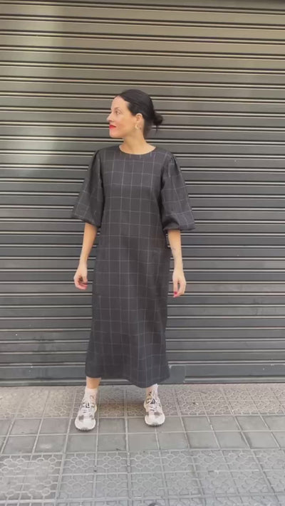 Vestido midi de cuadros en tonos oscuros, confeccionado en un tejido con cuerpo que lo hace perfecto para el otoño. Su silueta recta se combina con mangas abullonadas que le aportan volumen y un aire especial, mientras que los bolsillos delanteros le dan practicidad. Fácil de llevar con botines o mocasines, también puedes combinarlo con medias tupidas y un abrigo largo para un look elegante y cálido.