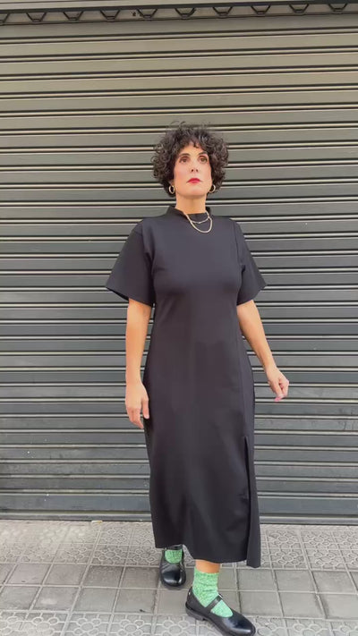 Vestido largo con una silueta ligeramente entallada. Las mangas tienen un corte holgado y se recortan justo por encima de los codos. El vestido tiene escote redondo y favorecedoras costuras princesa. En el lado izquierdo el vestido tiene una abertura alta.